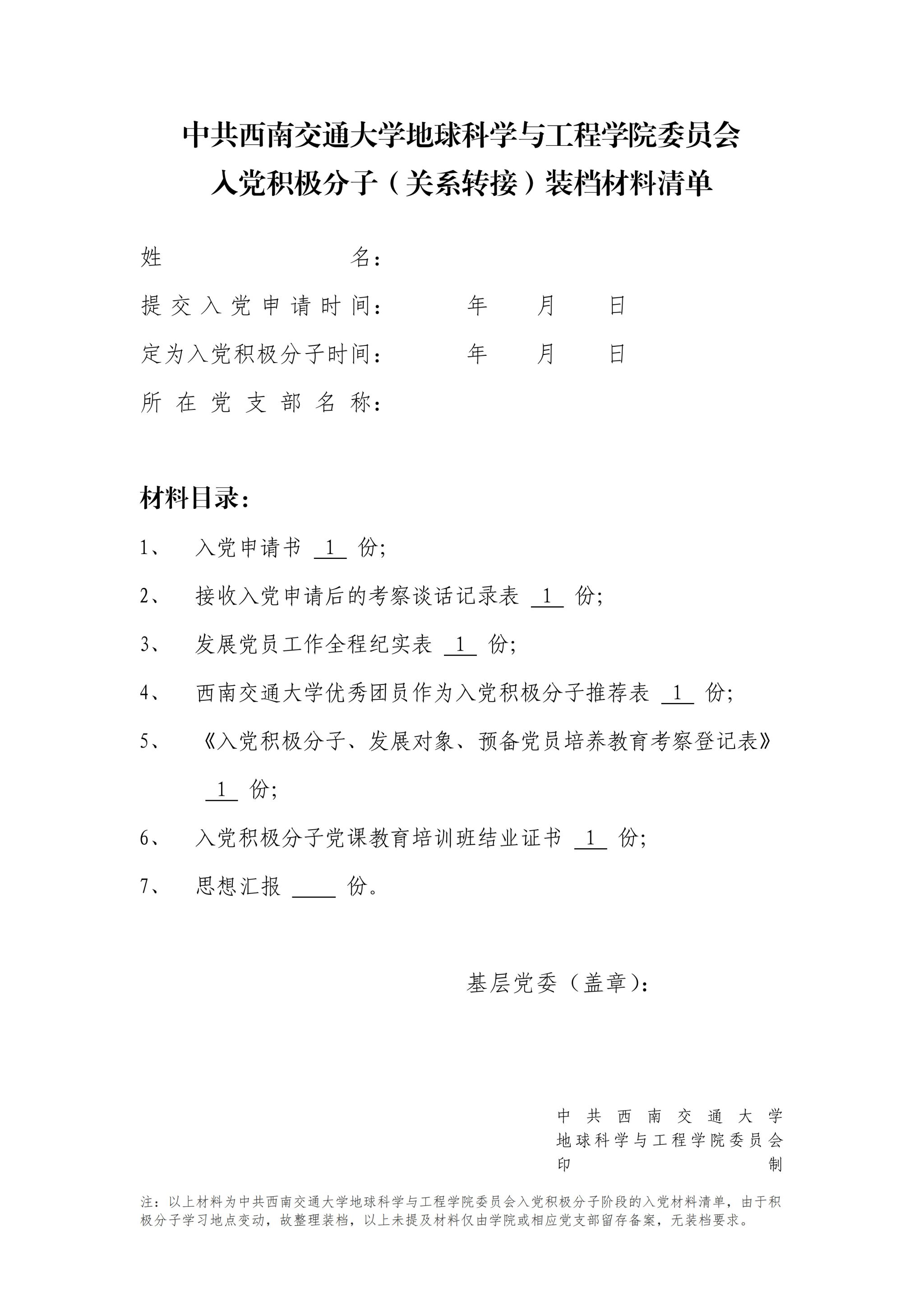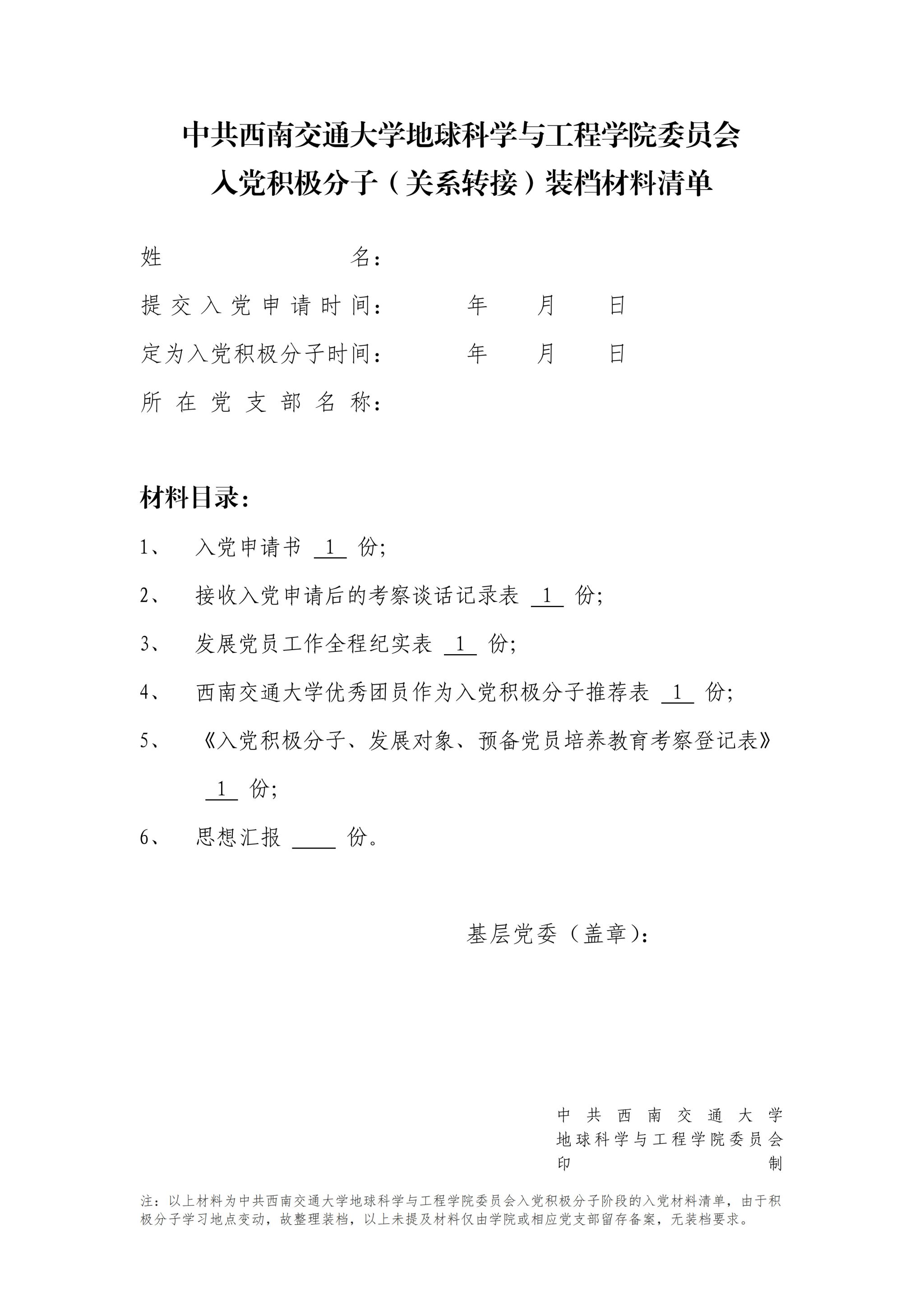 (1)入党积极分子(关系转接)装档材料清单样例: