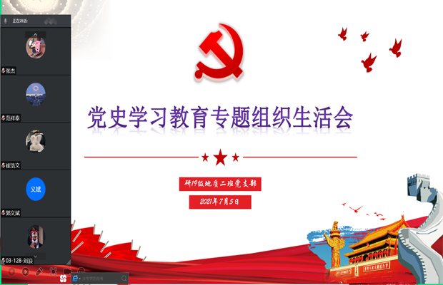 研19级地质2班党支部开展了“党史学习教育”专题组织生活会。本次活动主要由孙东东同志主持,会议内容主要包括学习“习近平总书记在庆祝中国共产党成立100周年大会上的重要讲话”和党员的批评与自我批评以及党支部问题的整改相关讨论。