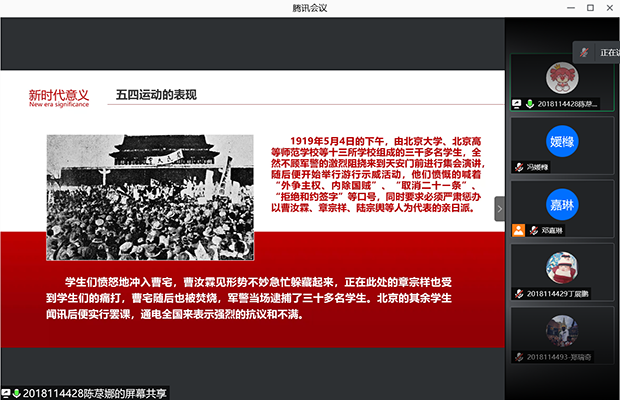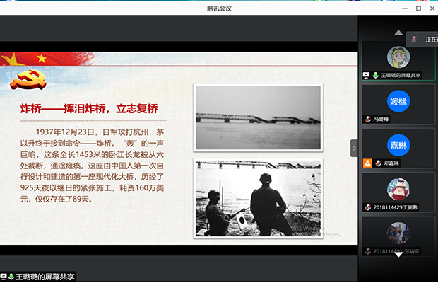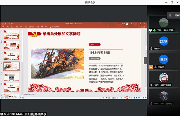 本18级第三党支部于7月5日晚上19:30在腾讯会议开展“讲党史故事,承红色基因”活动,即本18级第三党支部19位积极分子选择自己印象最深刻的一段党史,借助PPT展示,进行深情讲述,并分享自己的个人心得体会。