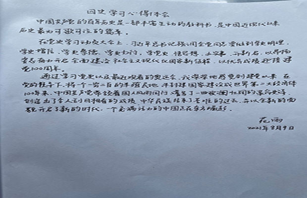 在暑假期间,支部成员积极参与读书活动,阅读了不同的党史书籍和资料。原原本本通读系列党史原著书籍,结合前期的“双亮行动”和“阅读百年党史,赓续红色精神”主题读书沙龙活动认真的学习了党史,书写了读书心得,在支部内交流读书体会,每个支部成员都发表了自己在阅读党史经典后的感悟与心得: