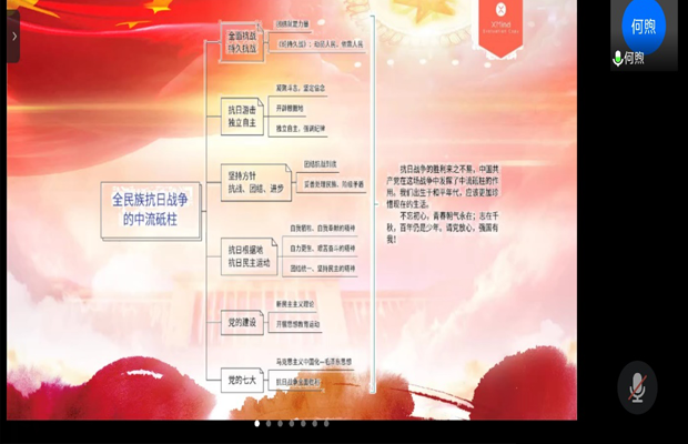 领学小组第四组组员何煦同志展示了其小组完成的思维导图,为大家讲述全民族抗日战争时期中,中国共产党是如何发挥其中流砥柱的作用。“不忘初心,青春朝气永在;志在千秋,百年仍是少年。请党放心,强国有我!”何煦同志铿