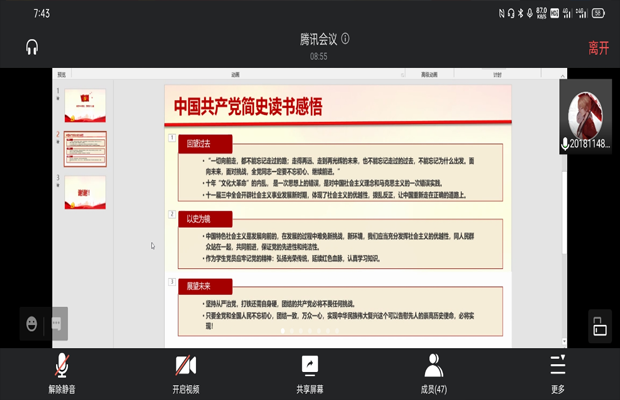 本18级第二党支部通过腾讯会议开展“暑期自学读书班”活动。本次会议由宋盼盼同志主持,党支部全体成员参加。