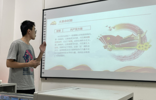 测绘一班代表展示了从《毛泽东选集》看新民主主义革命的相关介绍,带领大家从大革命时期、土地革命时期、抗日战争时期、解放战争时期四个方面了解了不同时期的历史背景和意义,进一步细化了党员同志对党史的了解。