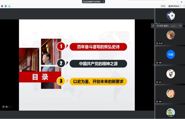 对大会内容同学们从以下三个方面展开了学习:1、党百年奋斗谱写的恢弘史诗;2、中国共产党的精神之源;3、以史为鉴、开创未来的新要求。