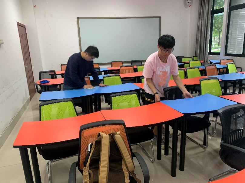 活动过程中,党支部成员王程、冯媛橼、刘民欢、邓嘉琳四位同志不仅利用自己携带的工具将四教一楼小教室的白板一一擦净,还对教室内的桌椅进行整齐摆放并将桌面擦净。
