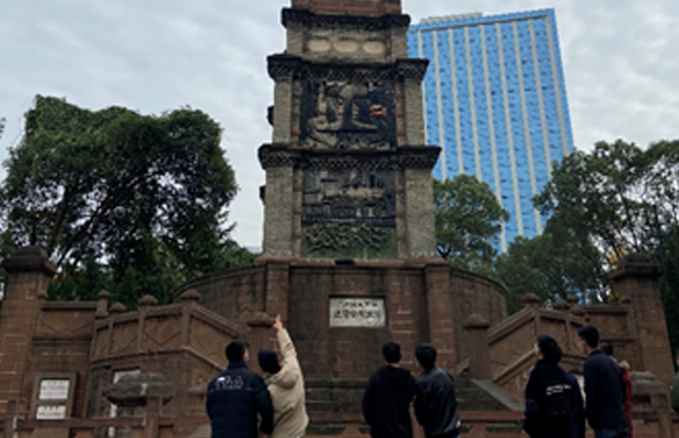简单讲解之后,大家分散开来围绕纪念碑自行参观,仔细查看了纪念碑的每一个细节,每个面上都有精美的图案和文字雕刻。略显斑驳但依旧雄伟的纪念碑上的每一块红砖都在向后世的参观者们诉说100多年前的那一场轰轰烈烈的保路运动。大家也似乎受到感染,在纪念碑周围走走停停,有的驻足思考,有的相互交流讨论,有人拿出手机拍下纪念碑宏伟高大的照片。