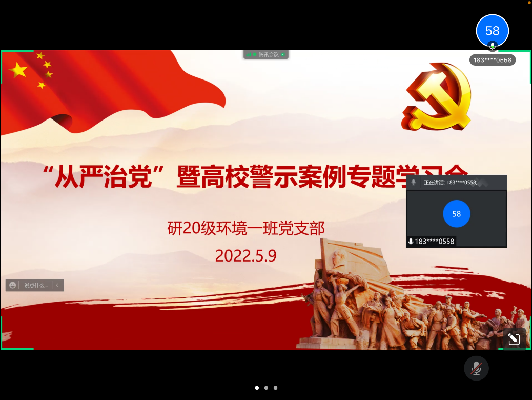 2022年5月9日星期一晚上九点,研20级环境一班党支部于腾讯会议召开“从严治党”暨高校警示案例专题学习会,主要内容为:深入学习王顺洪书记在18H