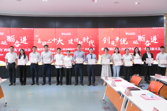 于X4243、X4520会议室举行“喜迎二十大·建功新时代” “七一”庆祝活动。学院党委书记关秦川、党委副书记、副院长许军华出席活动, 2021-2022学年“两优一先”表彰的党员代表以及2021年下半年发展的全体学生党员参加了此次活动。活动由学院党委副书记傅尤刚主持。