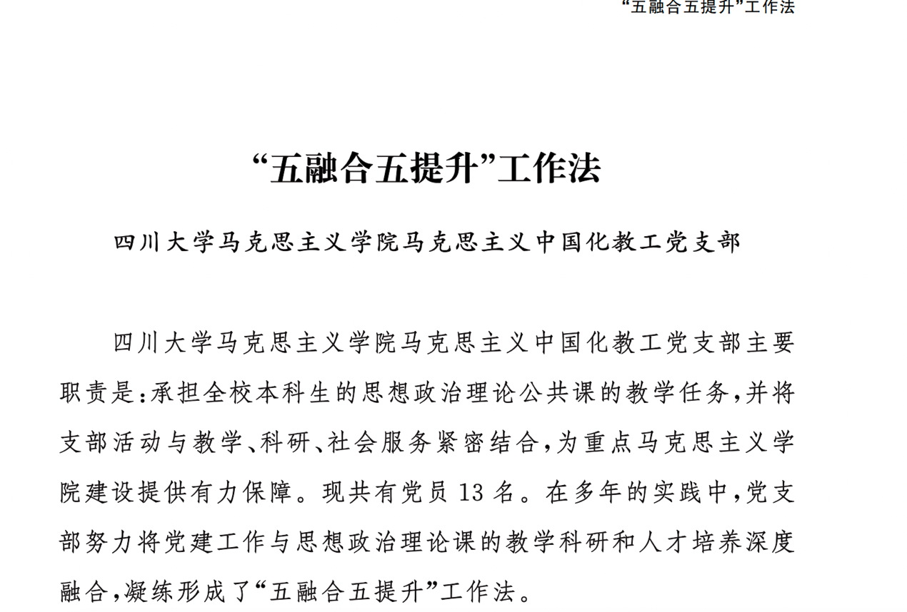 本次会议着重学习了四川大学马克思主义学院马克思主义中国化教工党支部“‘五融合五提升’工作法”,电子科技大学格拉斯哥学院教工党支部“‘联学 联建 联动’工作法”和18H