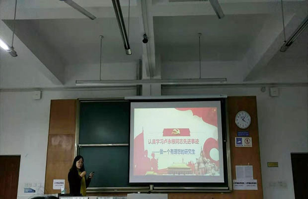 首先,龚正君教授向我们介绍了卢永根同志的生平事迹,卢永根是华南农业大学原校长、中国科学院院士,我国著名作物遗传学家,也是一名有着近70年党龄的老党员,一生节俭朴素,被誉为“布衣院士”。他始终发扬共产党员艰苦朴素、无私奉献的优良作风,家中使用上世纪八十年代的旧沙发、旧电视、旧铁架床,却将毕生积蓄8809446.44元全部捐赠给华南农业大学,设立教育基金。不仅如此,还将遗体无偿捐献给医学事业。龚正君教授也讲述了自己近20年的教育与科研经历,一个伟大的教育工作者始终是一名爱国者。而衡量一位教师是否具有爱国主义的思想政治素质,关键要有对教育事业的责任感和使命感。学习卢永根精神,首先要学习他的爱国主义精神。接着,龚正君教授还谈到卢永根同志所具备的坚持原则、严于律己、淡泊名利等优秀品质,展示了优秀共产党员应具有的时代风采。最后,龚正君教授讲到作为环境专业的研究生,更应在十九大精神的灌溉下,抓住机遇,为绿水青山寻找自己的那座金山银山。
