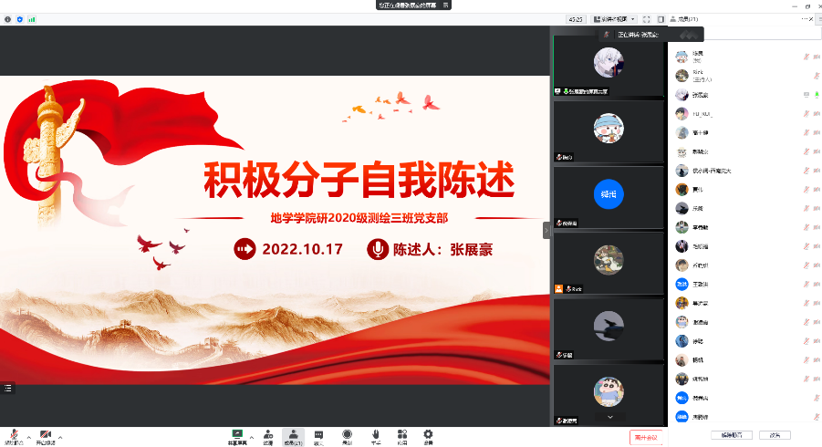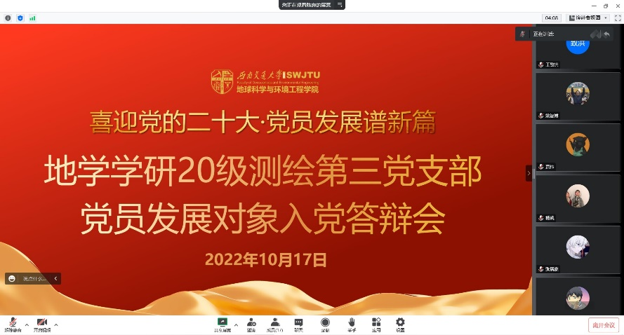 研20级测绘第三党支部于2022年10月17日20:00在线上开展了2022-02期发展对象人选的“推优入党答辩”大会。会议由组织委员陈良主持,全体党员和入党积极分子参加。