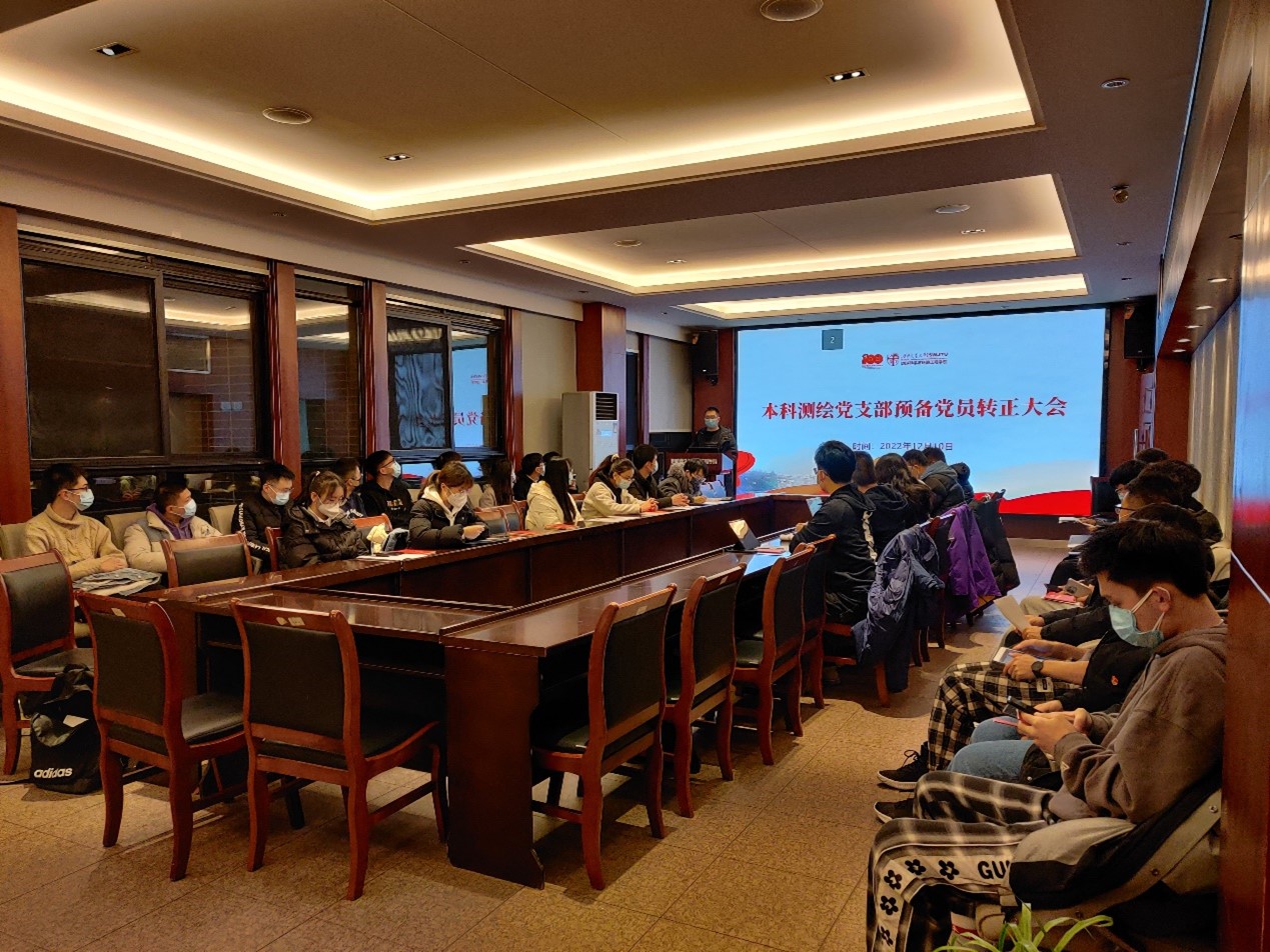 为切实提高党员发展对象综合素质,把好党员发展“入口关”,本科测绘党支部于2022年12月10日晚19:00开展预备党员转正大会,受到新冠疫情部分同学即将返乡的影响,本科测绘党支部同时也于当日晚21:00开展了党员接收大会。本次活动由党支部书记王文涛主持,党支部全体党员、二十一名预备党员以及八名发展对象出席本次会议。