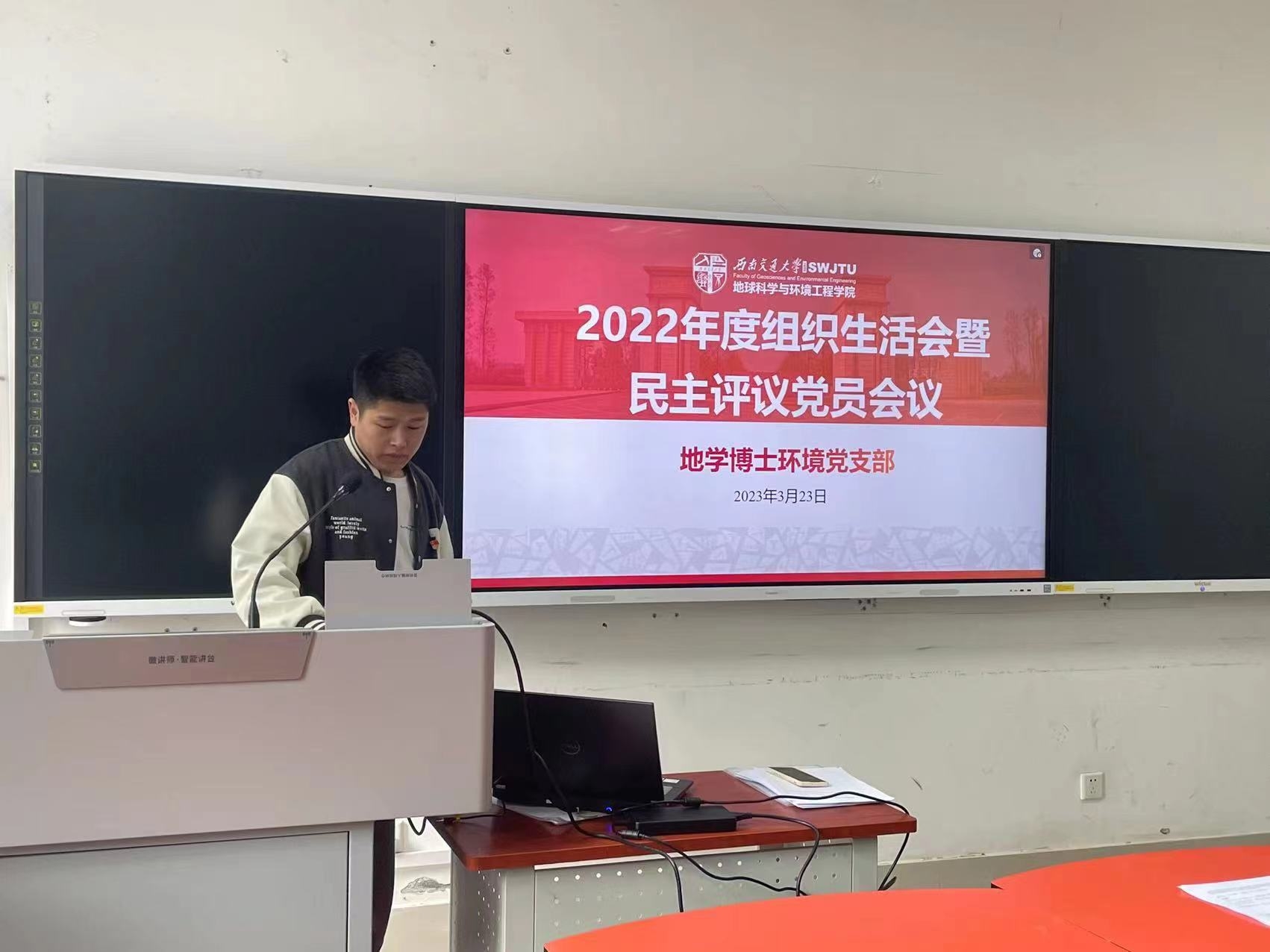 为深入学习贯彻党的二十大精神,坚持不懈用习近平新时代中国特色社会主义思想凝心铸魂,2023年3月23日下午,地学博士环境党支部在X4136召开2022年度组织生活会暨民主评议党员会议,会议由支部书记安官平主持,支部正式党员及预备党员参加。会议通过过线下和线上结合的方式进行,因学习研究在校外的党员同志通过腾讯会议参与。