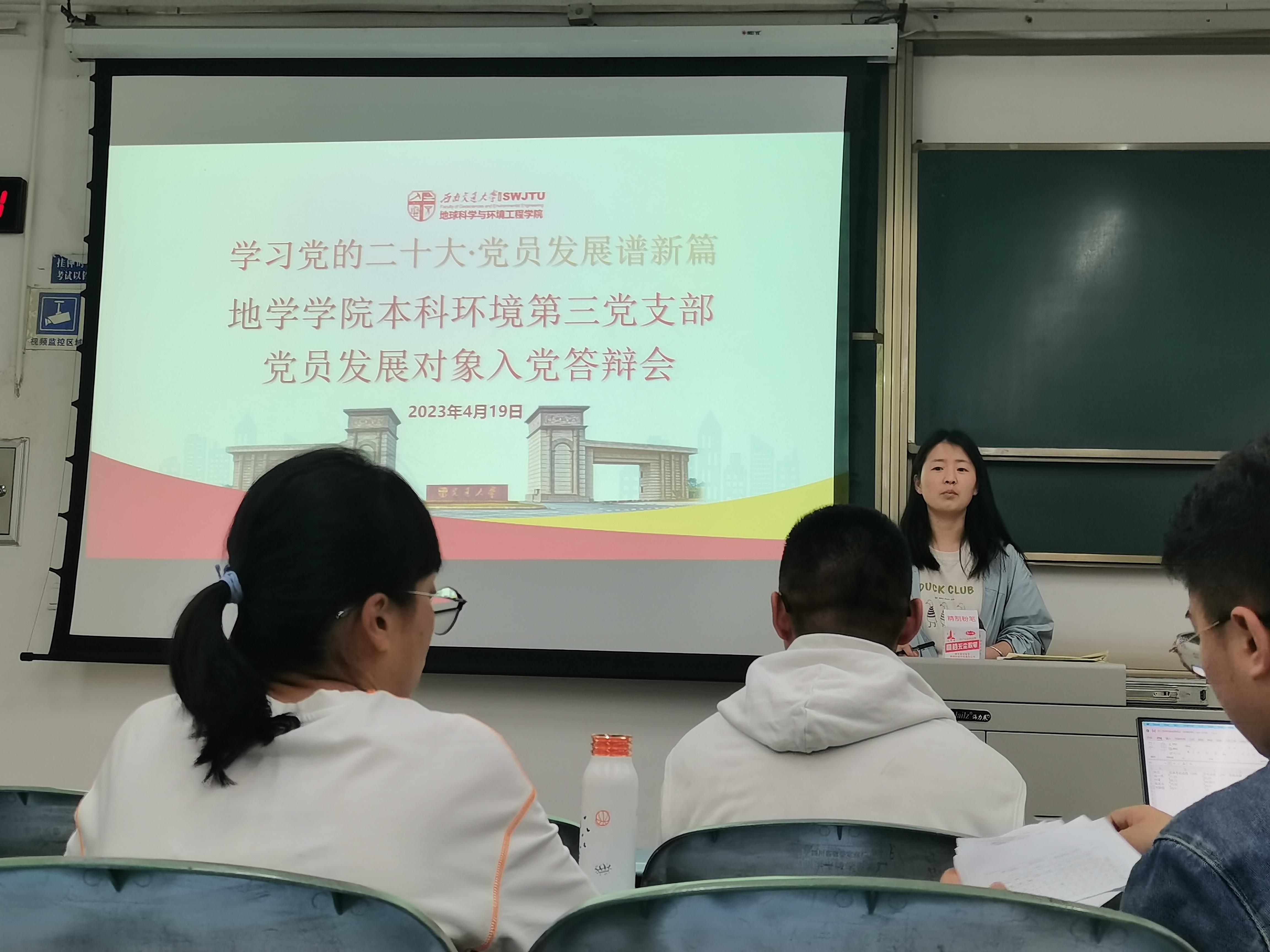 为做好2023年发展党员工作,切实提高党员发展质量。本科环境第三党支部于2023年4月19日19:30在X2333召开2023-01期发展对象答辩大会。本次大会由党支部书记钟若兰同志支持,本科环境第三党支部全体党员参与。