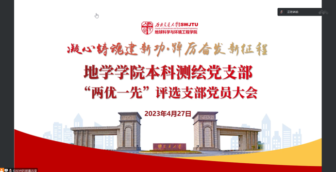 为深入学习传达学校和学院主题教育动员部署会精神,明确党支部下一阶段的工作重点方向,同时为为深入学习贯彻习近平新时代中国特色社会主义思想和党的二十大精神,深入贯彻落实学校第十五次党代会战略部署,充分发挥先进典型、模范人物的示范表率带动作用,本科测绘党支部于2023年4月27日晚19:00线上开展“践行二十大精神——筑牢国家安全校园防线”主题党日活动暨两优一先评选支部党员大会。本次活动由党支部书记任纪州主持,党支部全体党员出席本次会议。