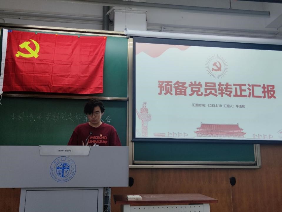 本科地质资勘党支部于2023年6月10日9:00在X4153召开预备党员转正大会,审议、讨论、表决关于预备党员牛浩然、彭俊岚等10名同志转为中共正式党员的相关事宜。本次大会由本科地质资勘党支部书记薛怡然同志主持,党支部正式党员应到28名,实到20名。