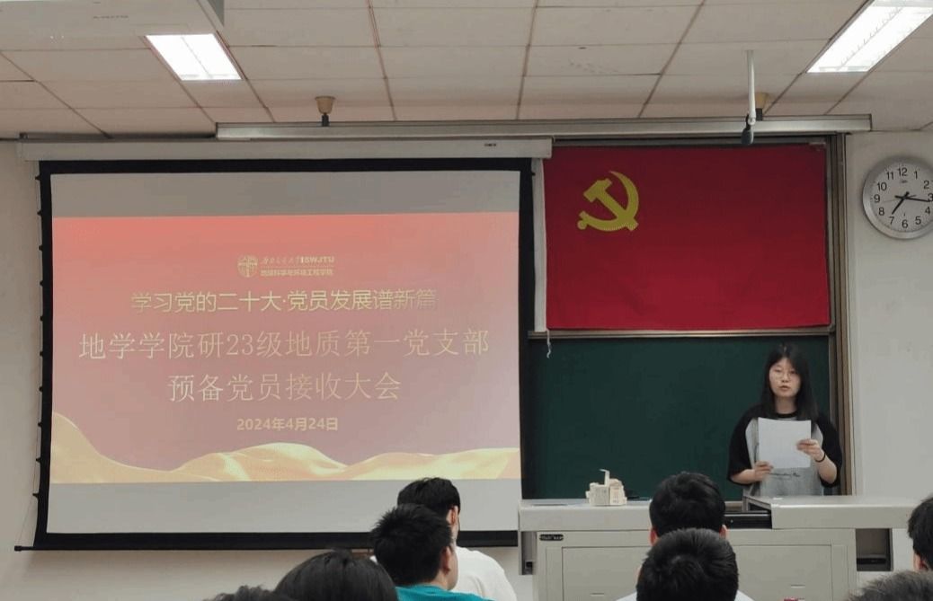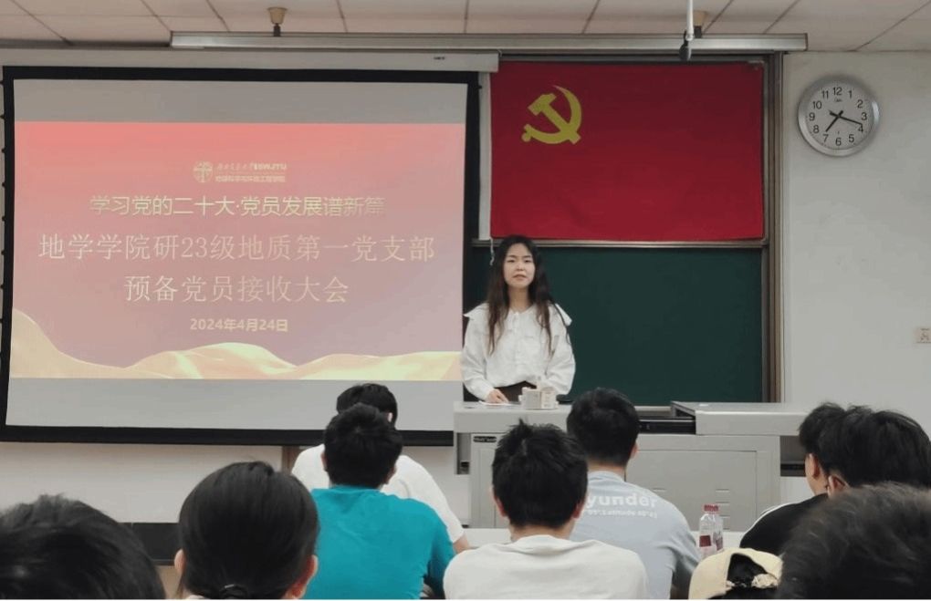 为做好2024年发展党员工作,切实提高党员发展质量。研23级地质第一党支部于2024年4月24日19:00在J4221召开2024-01期预备党员接收大会,本次会议由党支部书记张雨晴同志主持,支部党员、发展对象、入党积极分子和入党申请人总计17人与会。