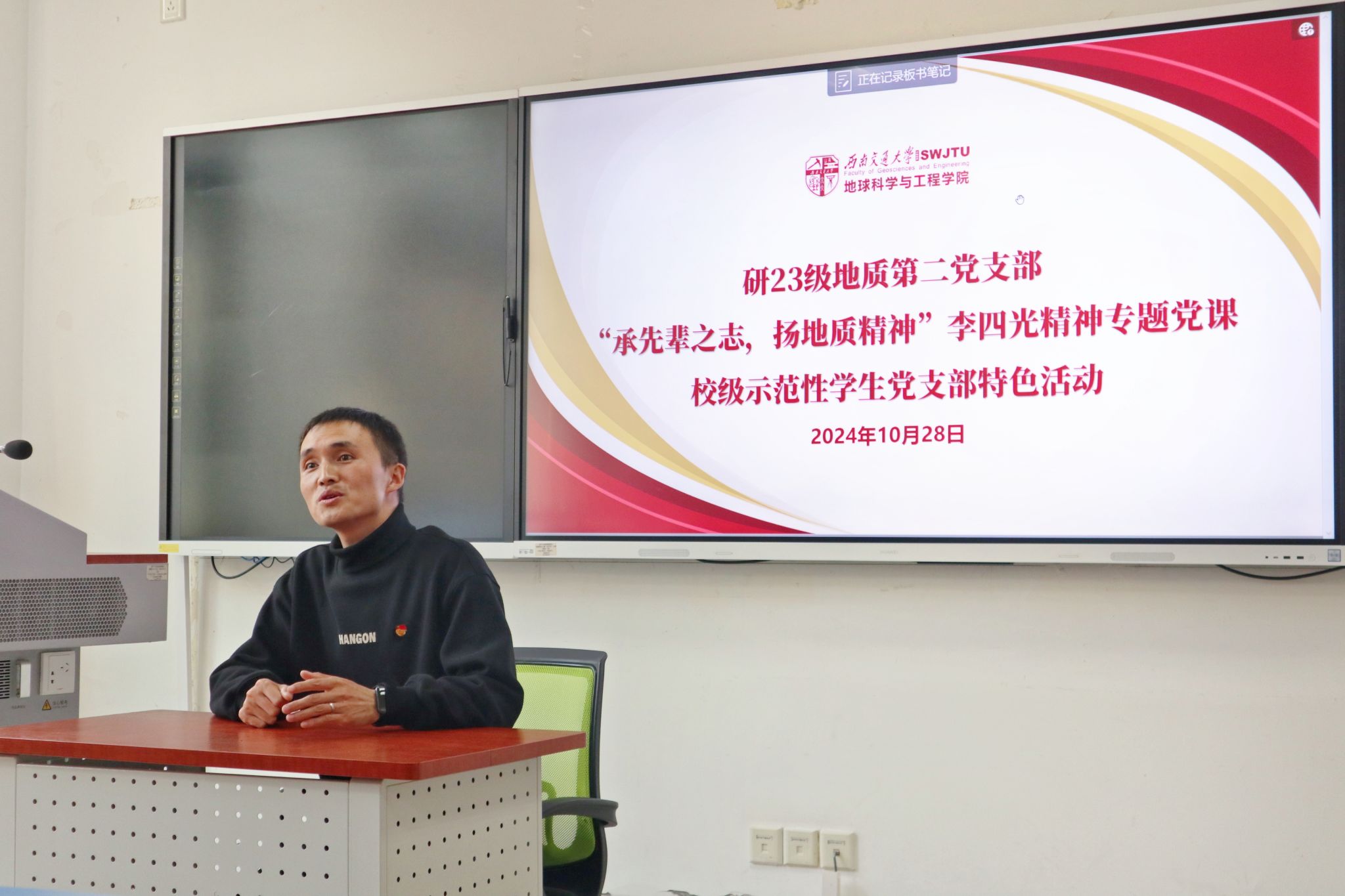青年讲师团成员杨洋同志为支部成员们讲授“承先辈之志,扬地质精神”青年讲师团专题党课,二是结合当前25届地质工程专业硕士研究生秋招的实际情况,邀请杨洋同志分享地质工程专业的求职面试经验,三是邀请研23级地质第二党支部的杨长进同志结合地质精神和科研精神,向与会成员们分享他在西藏自治区地质矿产勘查开发局的工作经历。