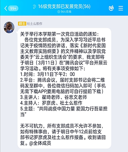 为深入学习习近平总书记关于疫情防控的讲话,落实《新时代爱国主义教育实施纲要》的文件精神以及学院党委关于“云上组织生活会”的要求,充分调动发挥在此次抗“疫”斗争中党支部的战斗堡垒作用和党员的模范先锋作用,18H