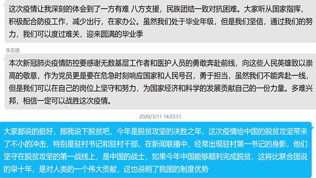 最后,由党支书进行总结,支部书记号召大家要以这次疫情中优秀的共产党员为榜样,不忘初心,牢记使命,将自己所学的专业知识多付出实践,为社会多做贡献。