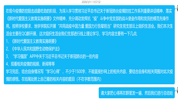 首先,支部书记汪琴琴同志要求大家学习《新时代爱国主义教育实施纲要》、《中华人民共和国野生动物保护法》、“学习强国”APP中关于习近平总书记关于新冠肺炎的一些内容、观看相关疫情的视频和新闻等等,看完之后写不少于1500字的学习心得,然后发在QQ群大家进行讨论学习。