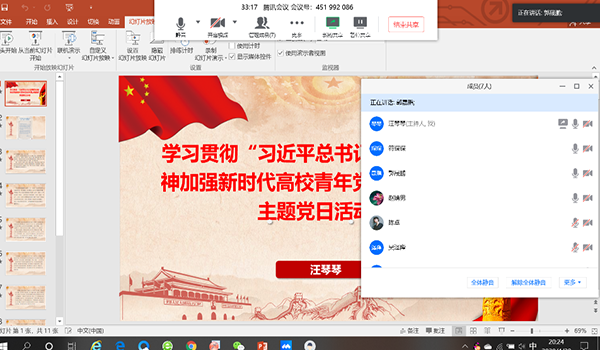 本次主题党日活动主要是学习贯彻“习近平总书记重要回信精神加强新时代高校青年党员队伍建设”,本次会议由党支部书记汪琴琴同志主持,共有6名同志参加,以腾讯会议的形式开展。首先汪琴琴同志给大家分享了习近平总书记回信的原文,然后介绍了本次湖北武汉援鄂医疗队员情况,分析了“90后”“00后”在这次疫情中的占比,并且观看了3个短视频,这三个短视频主要讲述的是“90后”“00后”在抗疫中的故事,最后每个参会人员都发表了自己的感言。