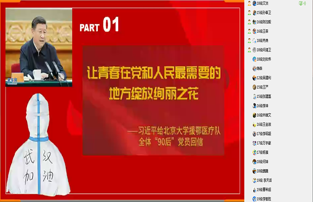 首先,支部书记给大家介绍了习近平总书记重要回信的背景并带领大家一起学习了回信内容。在这次抗击疫情的斗争中,以“90后”为代表的青年一代挺身而出、担当奉献,充分展现了新时代中国青年的精神风貌。3月11日,北京大学援鄂医疗队的34名“90后”党员给习近平总书记写信,汇报了在抗疫一线抢救生命的情况,表达了继续发挥党员作用、为打赢疫情防控阻击战贡献力量的决心。3月15日,习近平总书记给北京大学援鄂医疗队全体“90后”党员回信,高度赞扬了北京大学援鄂医疗队的青年党员在疫情防控斗争的一线不畏艰险、冲锋在前、舍生忘死、交出合格答卷的精神,充分肯定新时代的中国青年是好样的,是堪当大任的。勉励他们努力在为人民服务中茁壮成长、在艰苦奋斗中砥砺意志品质、在实践中增长工作本领,继续在救死扶伤的岗位上拼搏奋战,让青春在党和人民最需要的地方绽放绚丽之花。