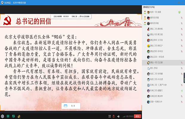 本科2019级党支部于线上顺利开展“学习回信精神,勇担时代之任”主题党日活动。2019级辅导员李婧、何杨老师和2019级党支部成员参加此次活动。本次会议由袁媛同学主持。