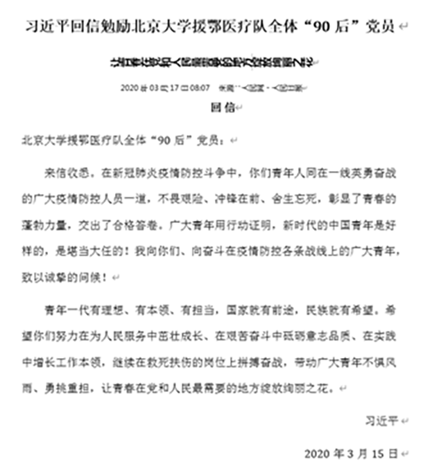 会议第二阶段,邓嘉琳等三位同志都分别对信中的内容说出了自己认为最深刻的句子,表达了对习近平总书记回信的体会感悟,以及对疫情期间医护人员的敬佩和赞美。习近平总书记在给北京大学援鄂医疗队全体“90后”党员的回信中写道:“广大青年用行动证明,新时代的中国青年是好样的,是堪当大任的!”这让全国高校青年师生倍感振奋、备受鼓舞,激励着广大青年勇挑重担,为打赢疫情防控阻击战贡献力量,让青春在党和人民最需要的地方绽放绚丽之花。