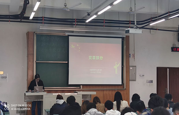 首先,学习部部长黄淑怡带领各位入党积极分子学习了党章的内容,着重强调了党章新增内容和申请入党的条件、党员义务、入党誓词等内容,并对党课考试进行了简要分析,强调党课考试主要有选择题,填空题,简答题等试题类型,要求各入党积极分子态度认真严肃,认真学习党章内容,诚信作答。