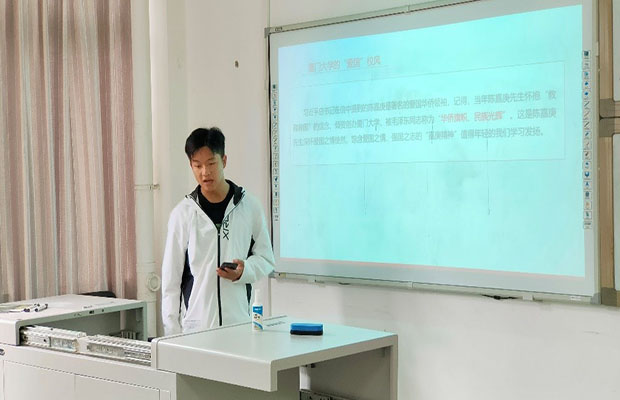该小组成员黄子奇同志也为我们介绍了厦门大学关于“革命”精神和“自强”精神的杰出事迹,最后他以著名格言“天行健,君子以自强不息”激励我们,自强就是在我们面对挑战时,要学会积极主动地去应对,自己要先行动起来,才能获得他人的援助,才能不断地在事中提升自己的能力。