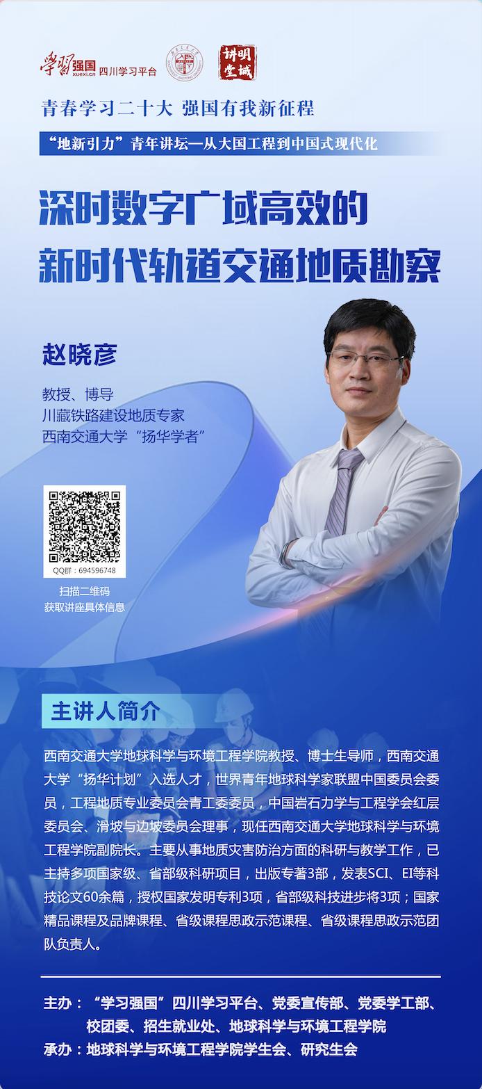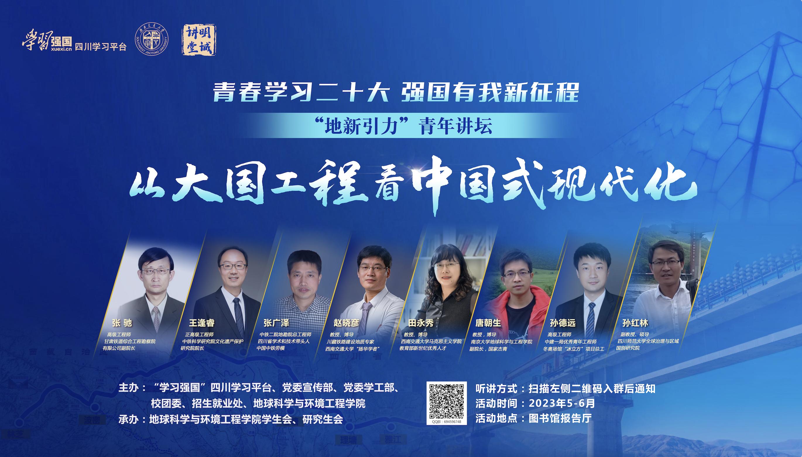 在“学习强国”四川学习平台、党委宣传部、党委学工部、校团委以及招生就业处的支持下,邀请了大国工程一线以及思想政治教育与人文社科领域的专家、学者、教授为主讲嘉宾,通过“地新引力”青年讲坛的方式,为青年学生解惑授业、增知识、长才干,号召广大学生立志做有理想、敢担当、能吃苦、肯奋斗的新时代好青年。2023年5月4日,值此青年节之际,“地新引力”青年讲坛——“从大国工程看中国式现代化”开讲仪式暨专题一、专题二讲座即将开始,现就相关通知如下: