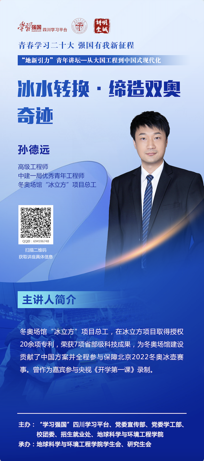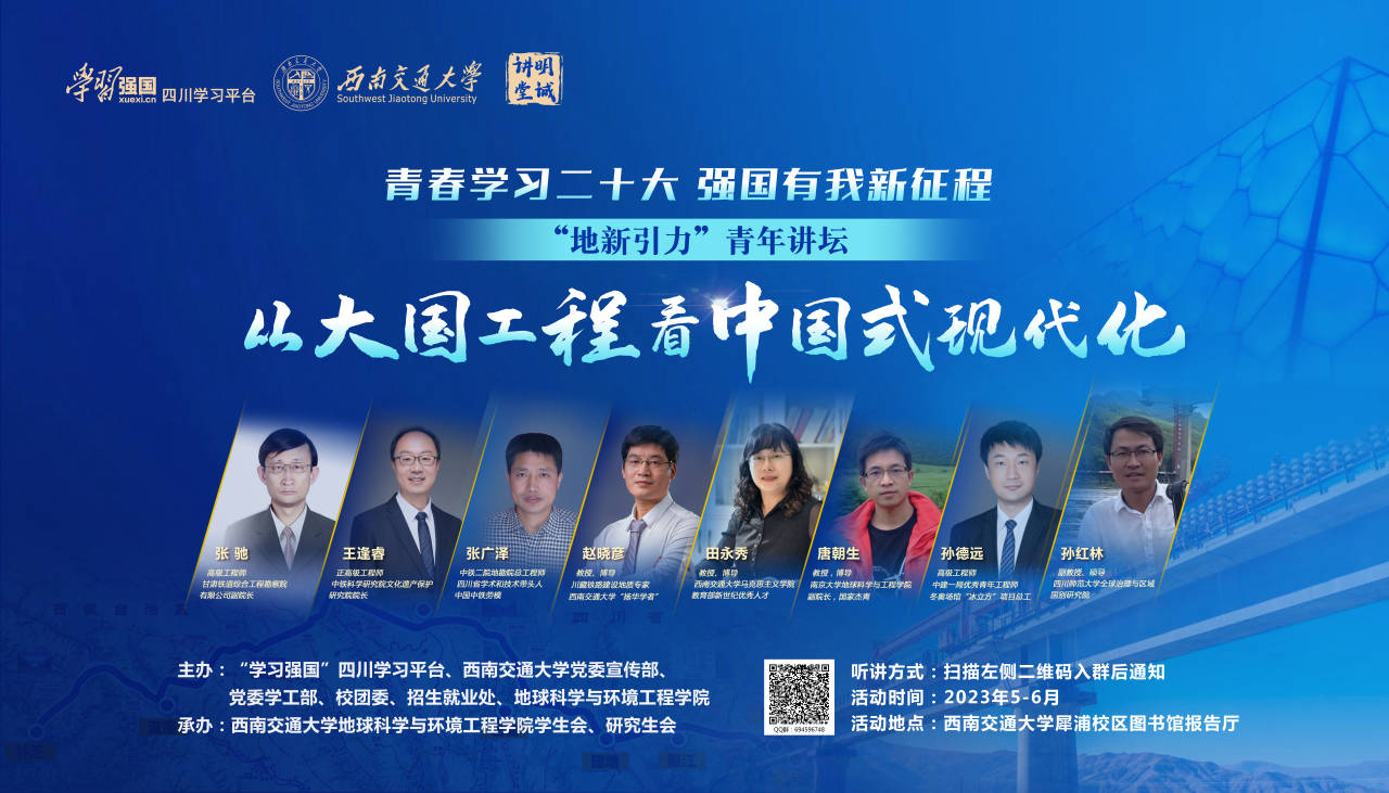 在“学习强国”四川学习平台、党委宣传部、党委学工部、校团委以及招生就业处的支持下,邀请了大国工程一线以及思想政治教育与人文社科领域的专家、学者、教授为主讲嘉宾,通过“地新引力”青年讲坛的方式,为青年学生解惑授业、增知识、长才干,号召广大学生立志做有理想、敢担当、能吃苦、肯奋斗的新时代好青年。“地新引力”青年讲坛——“从大国工程看中国式现代化”专题七讲座将于2023年5月25日举行,现就相关通知如下: