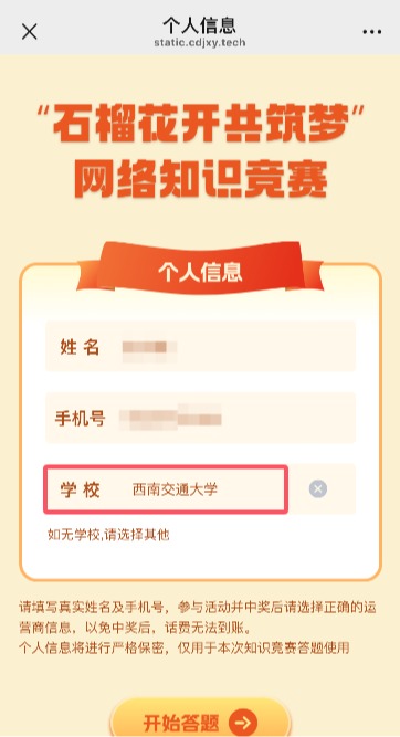 )、个人姓名、手机号码(个人信息将进行严格保密,仅用于本次知识竞赛答题使用)