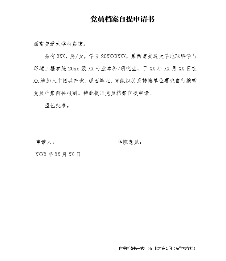 党员档案自提申请书