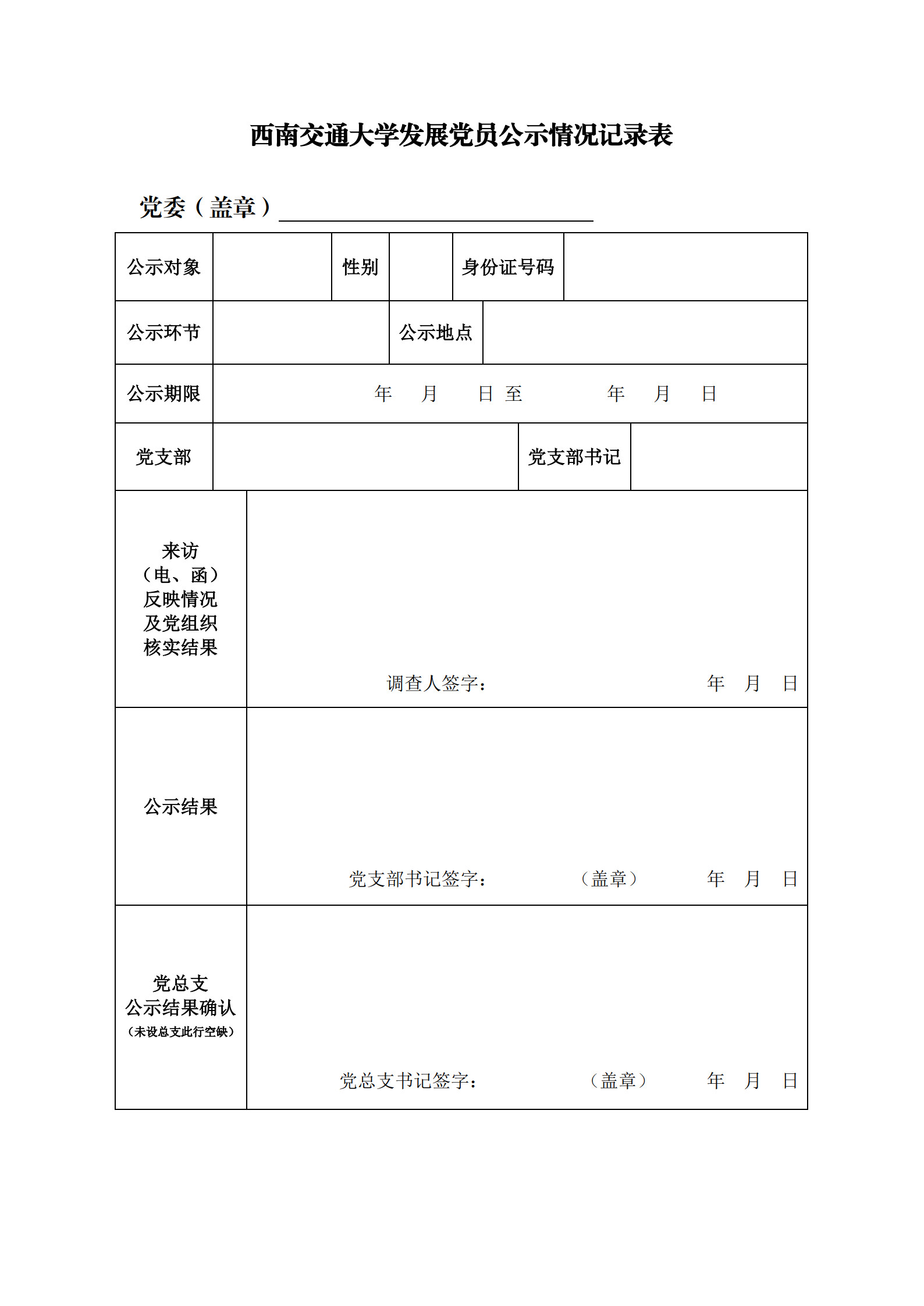 关于发展党员公示情况记录表上党委、党委盖章、公示地点应当写18H