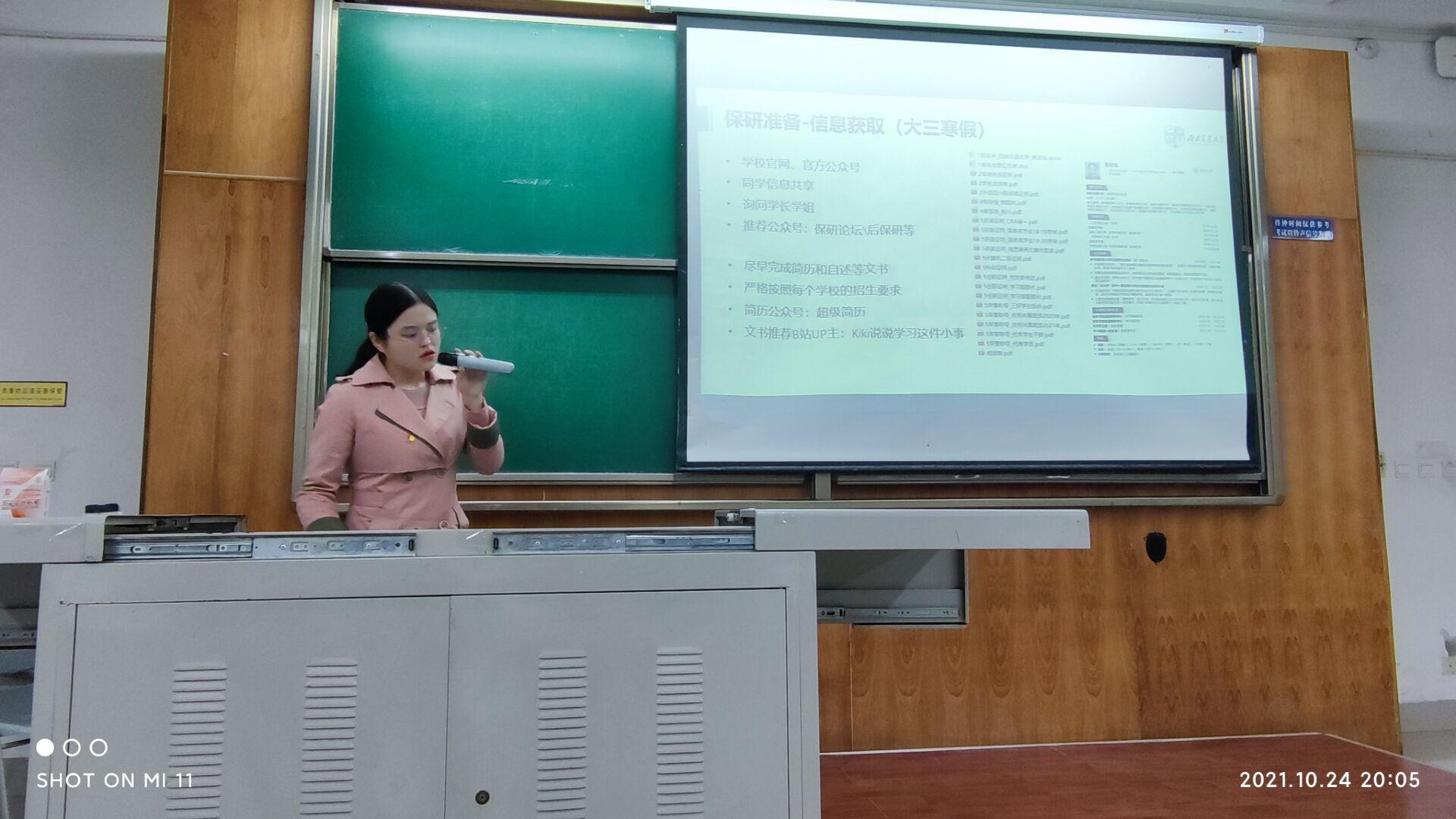 黄淑怡学姐成功推免至武汉大学,她向同学们详细讲述了保研的条件要求、前期准备以及流程使同学们保研细则有了更为系统全面了解。