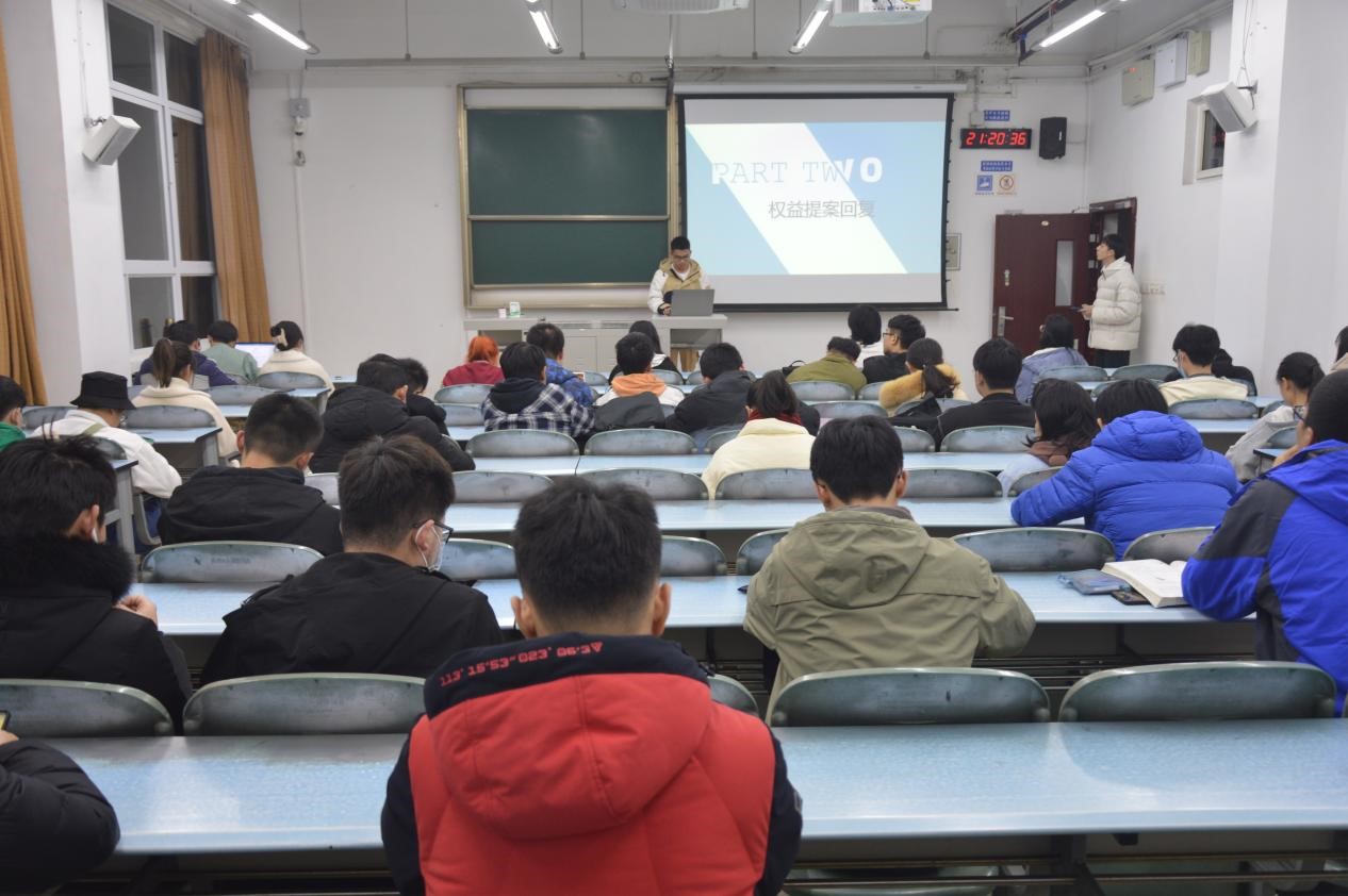姜亮亮针对第一次线上权益大会收集到的权益提案,对同学们反映的寝室通电以及热水情况、课堂铃声、食堂菜品等方面的问题进行统一回复,并给出最后商讨出的解决方案。随后各班权益与生活委员现场提问,学生园区与事务中心成员进行解答。