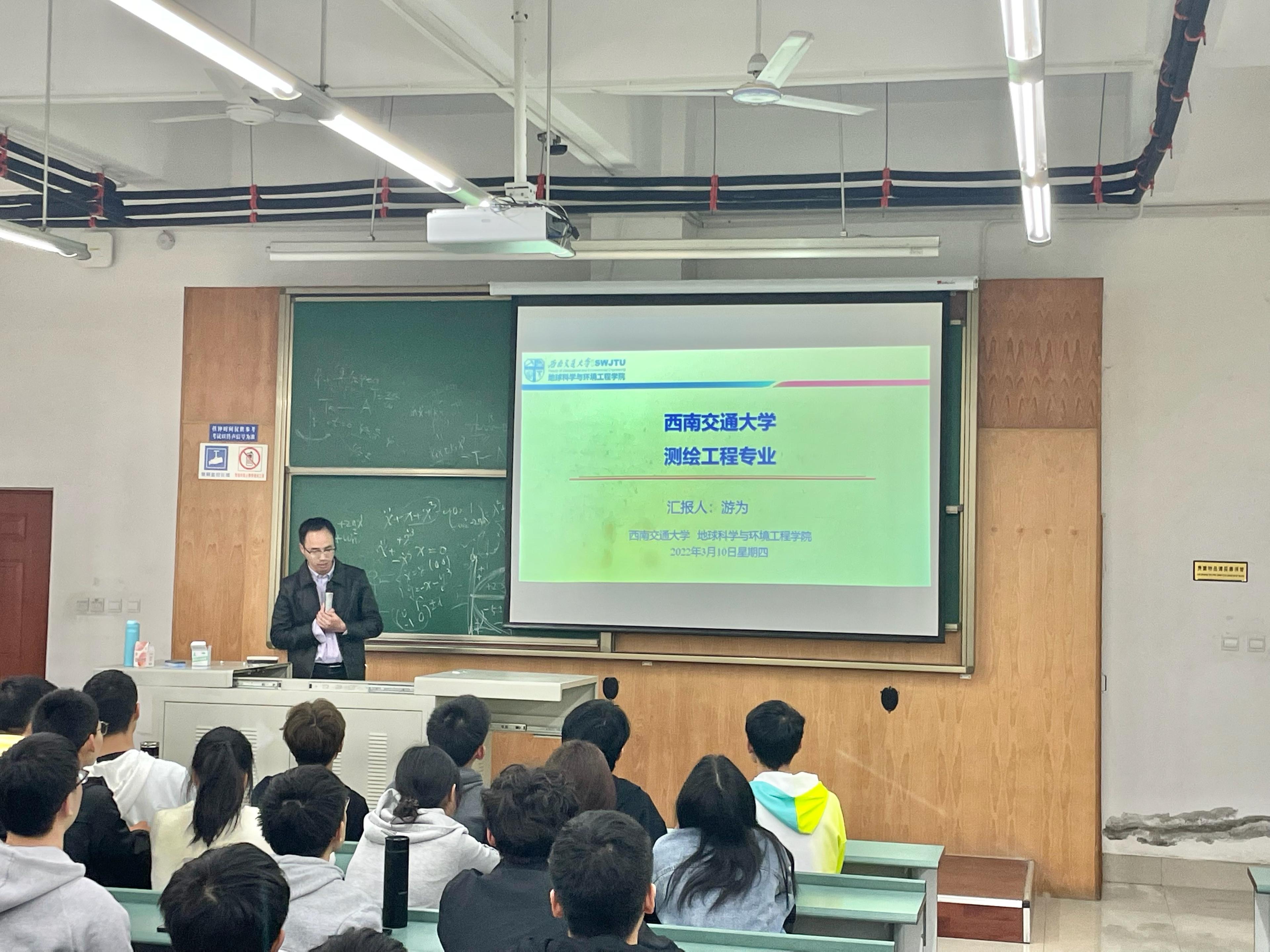 宣讲会开始,游为老师从专业的发展历史、师资力量、培养目标、专业定位、就业前景以及学科发展情况等方面对测绘工程专业进行了详细的介绍,改变了同学们对测绘工程专业的传统认知。同时,游为老师向同学们展示了我校测绘工程专业在铁路行业所取得的重大成就。他表示,不管是在珠峰高程测量,还是高速铁路精密测量,测绘工程专业都将发挥其重要作用。