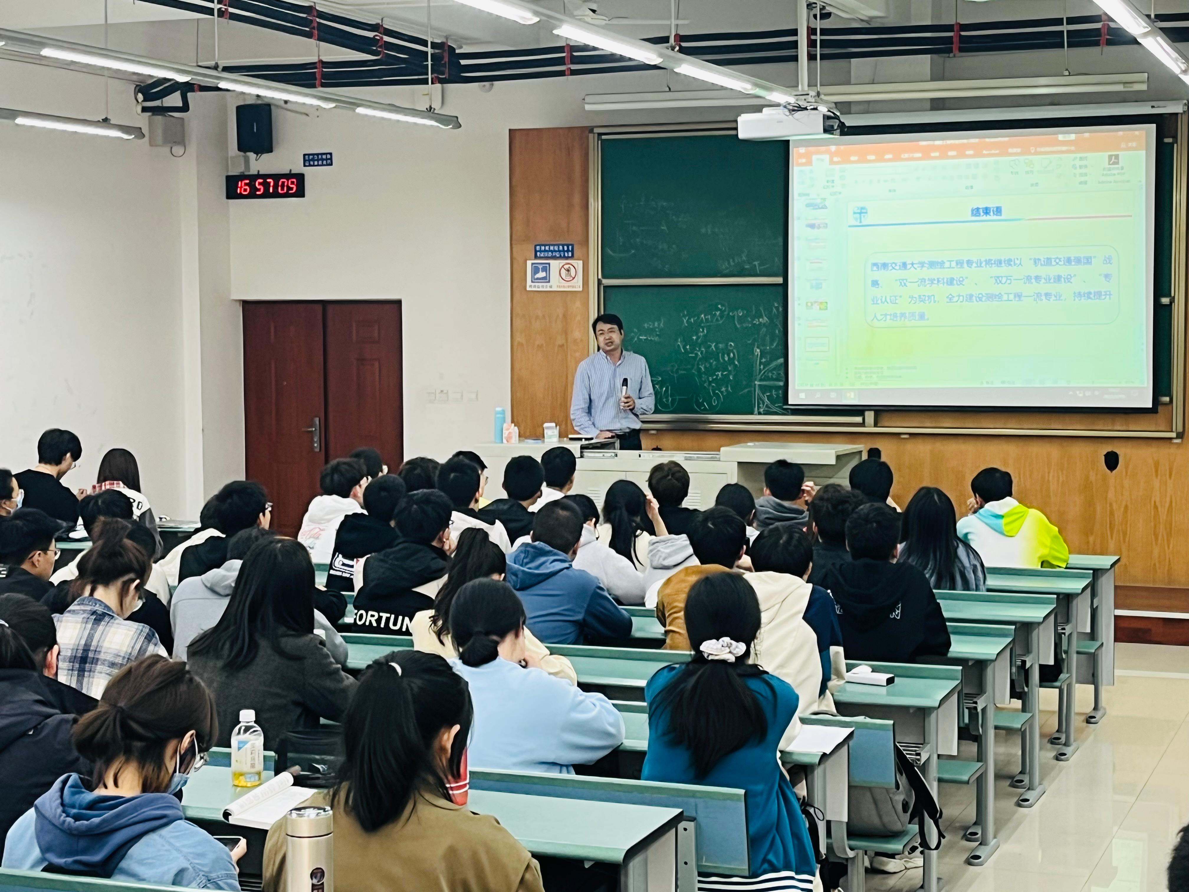 于X4158召开测绘类专业分流宣讲会。宣讲会由测绘遥感信息系系主任曹云刚、测绘遥感信息系副系主任游为主讲、本科2021级辅导员史可心主持,本科2021级测绘类全体学生参加。