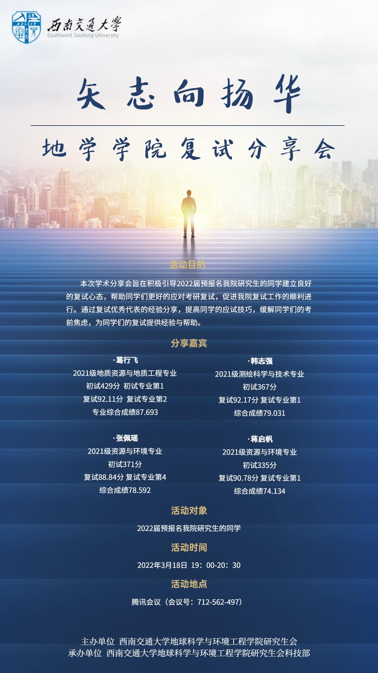 经过了考研初试的拉锯战,如今考研成绩和国家线都已公布,考研复试即将到来之际,不少临考同学又开始出现了紧张焦虑的心里状态,对即将到来的复试充满未知。作为交大未来的新鲜血液,应该对未来充满希望和斗志,调整好心态应对复试弘扬交大的风采,才是新一代学子们应该的面貌。因此为了进一步提高2022届预报名我院研究生的同学的知识储备,帮助同学建立复试信心,进而促进我院复试工作的顺利进行,本次复试经验分享会邀请到了2021级测绘、地质、资环三个专业的复试优秀代表,为2022届预报名我院研究生的同学分享他们在考研复试过程中的心得体会。