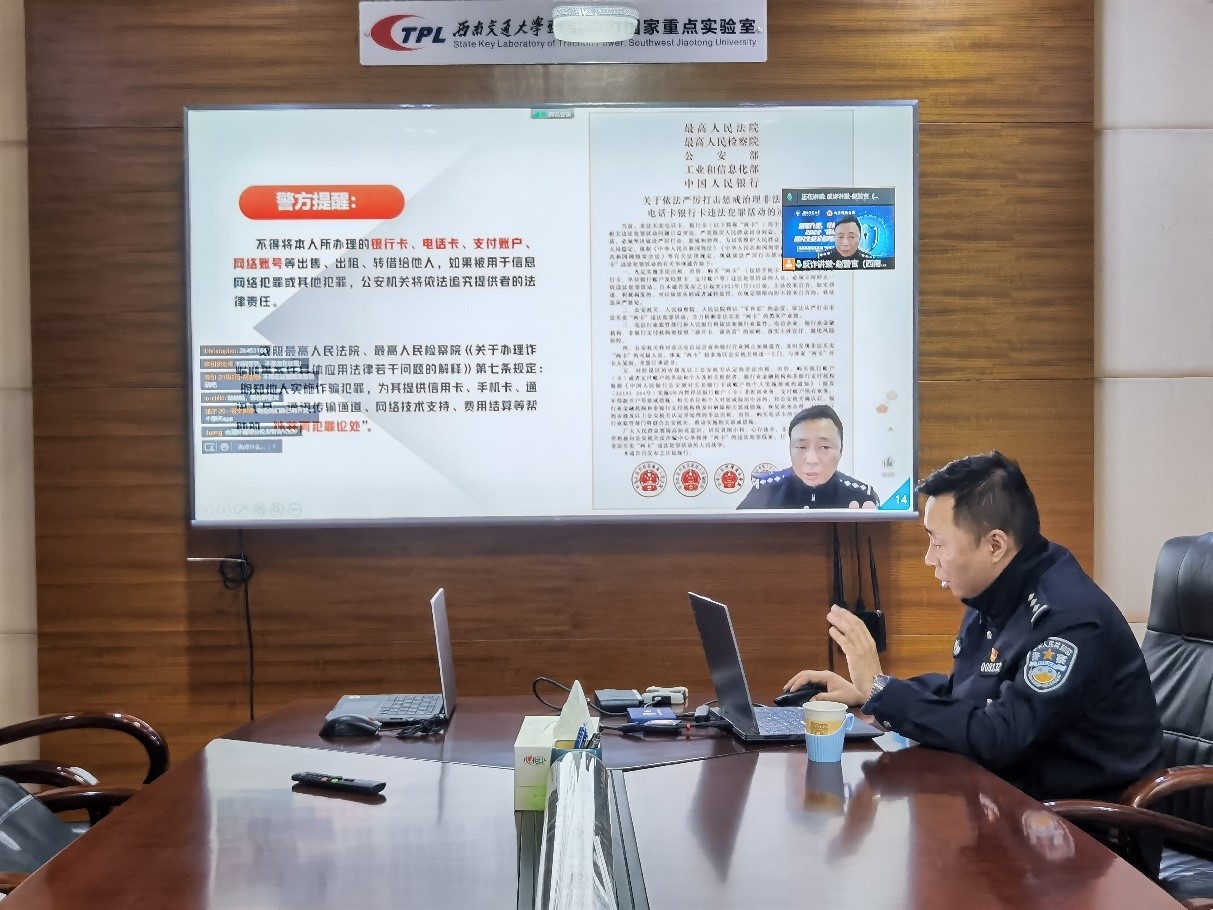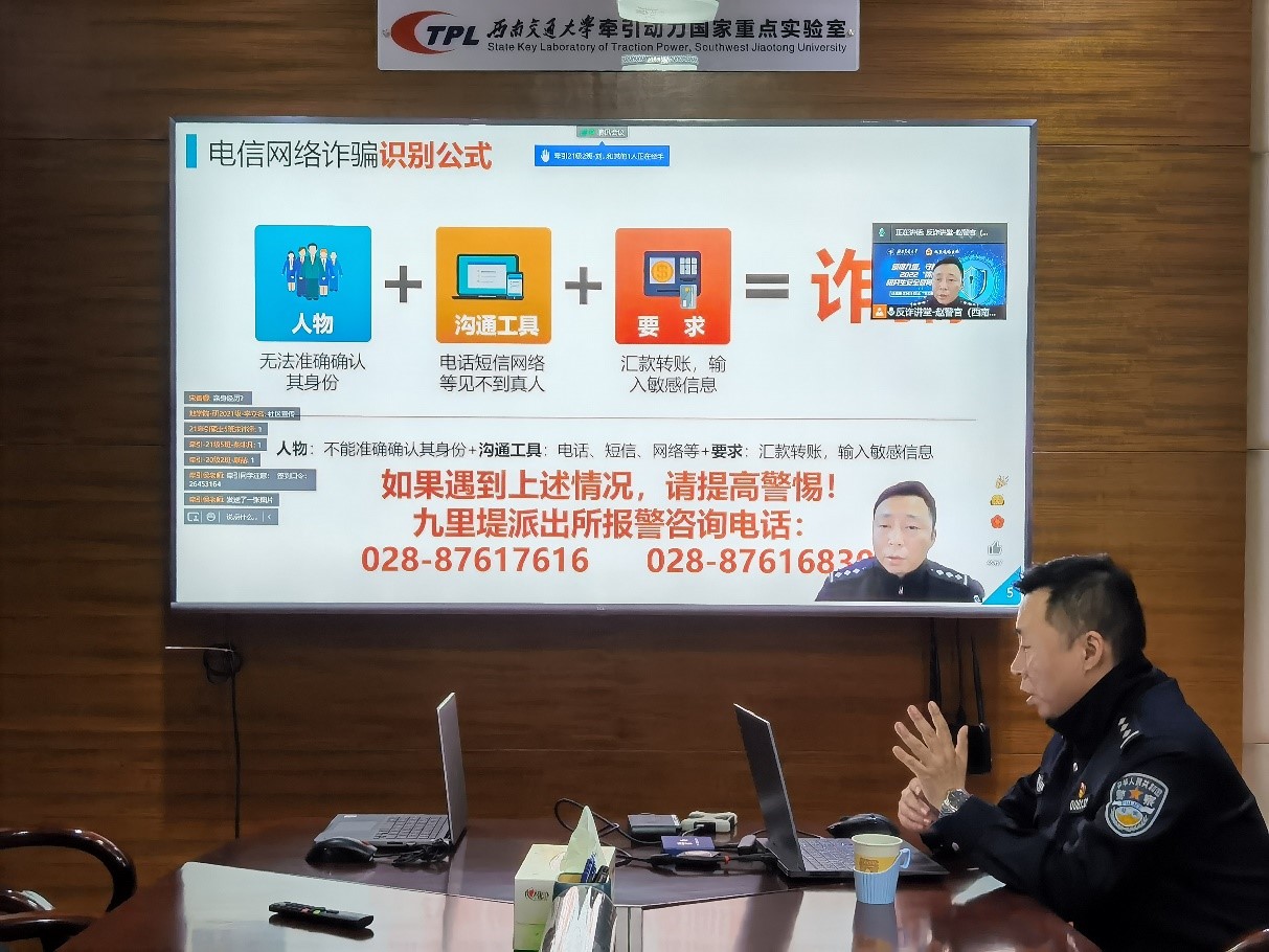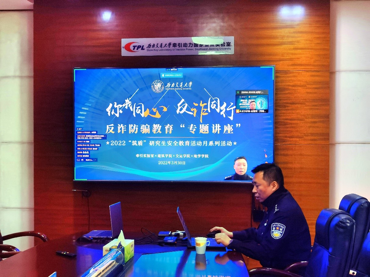 联合牵引动力实验室、建筑学院、交运学院共同举办了“你我同心 反诈同行”——反诈防骗教育“专题讲座”。根据疫情防控需要,本次讲座通过腾讯会议线上召开,特邀九里堤派出所赵磊警官担任主讲人,18H