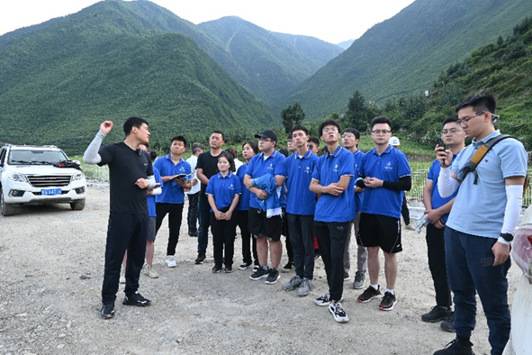 副院长赵晓彦老师讲解了康定市建设川藏铁路的主要难点,分析了当前所在工程的地质结构特点与环境保护难点。赵晓彦老师将山体的碎屑岩生动形象地比喻成“靠在一起的一颗颗黄豆”,帮助团队成员产生了直观深刻的理解。