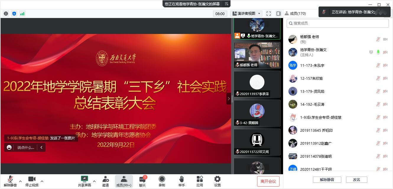 2022年9月22日下午13:30分,地球科学与环境工程学院2022年暑期“三下乡”社会实践总结表彰大会于腾讯会议线上顺利举行。18H