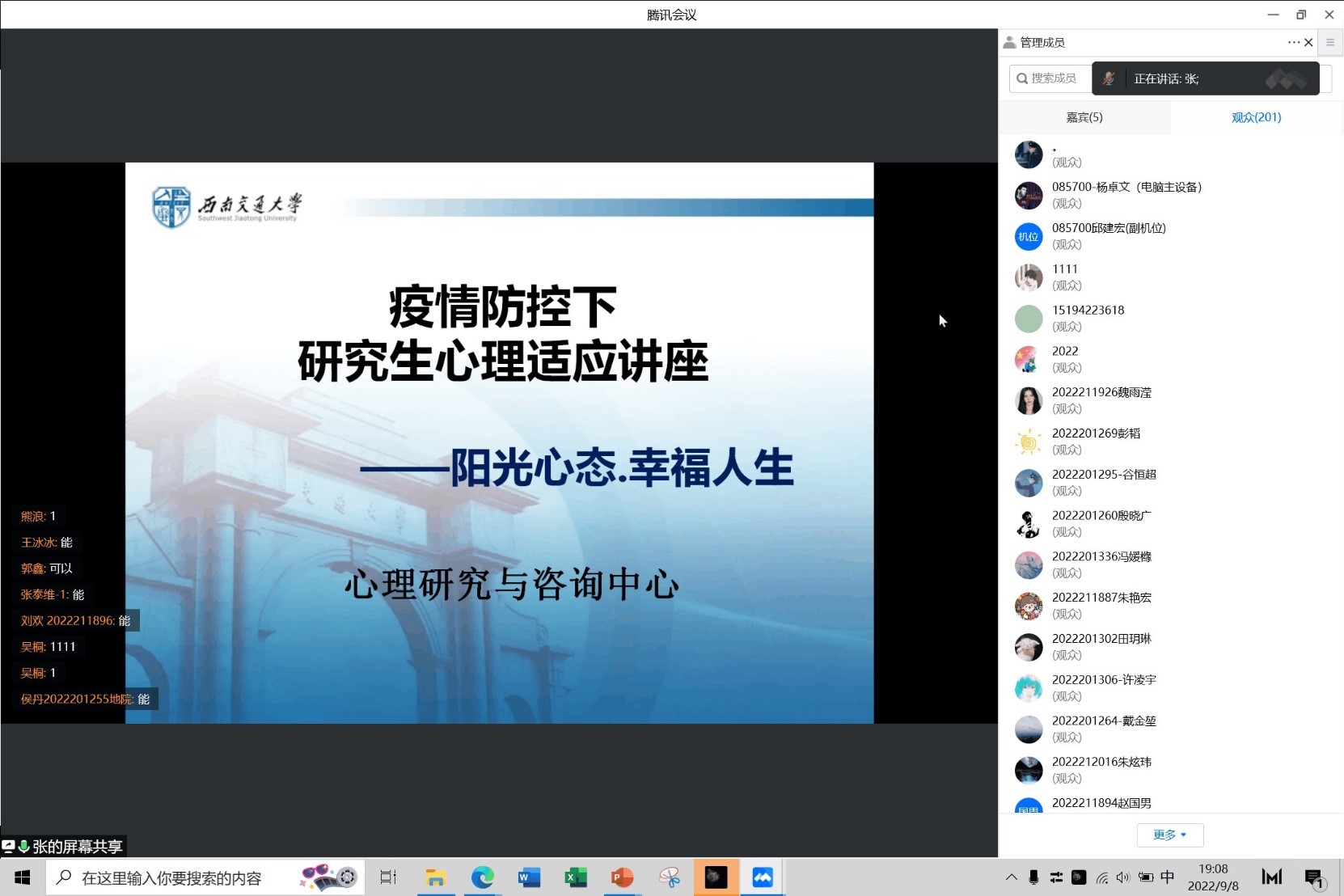 通过腾讯会议举办了以“阳光心态,幸福人生”为主题的心理健康教育讲座。此次讲座由心理研究与咨询中心的张涛老师主讲,2022级研究生辅导员崔宇龙老师主持,分管学院心理工作的史可心老师和2022级全体研究生新生参加。
