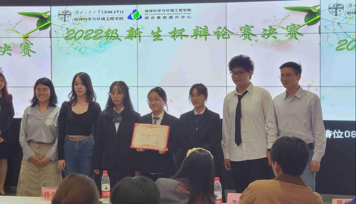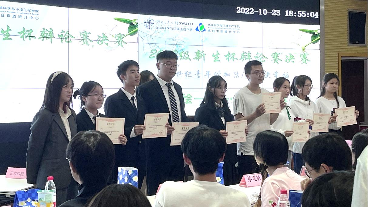 议程最后一项,在全体评委投票统计结束之后,主持人宣布比赛结果。获得此次新生杯辩论赛冠军的为反方辩论队地质二班,获得亚军的为正方辩论队测绘一班,同时获得此次2022新生杯辩论赛决赛最佳辩手的为反方三辩。随后,由杨都强老师、孙慧敏老师和陈荩娜老师分别为获奖的队伍及本次新生辩论赛中产生的23位最佳辩手颁发了荣誉证书。