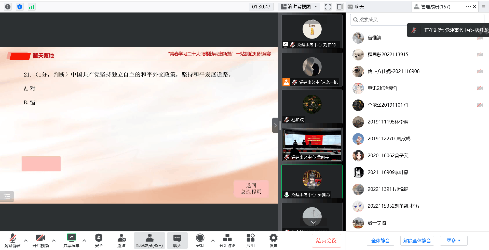 党建事务中心承办的“青春学习二十大·培根铸魂谱新篇”——一站到底知识竞赛决赛在X4243报告厅顺利举行。出席本次决赛的嘉宾有18H