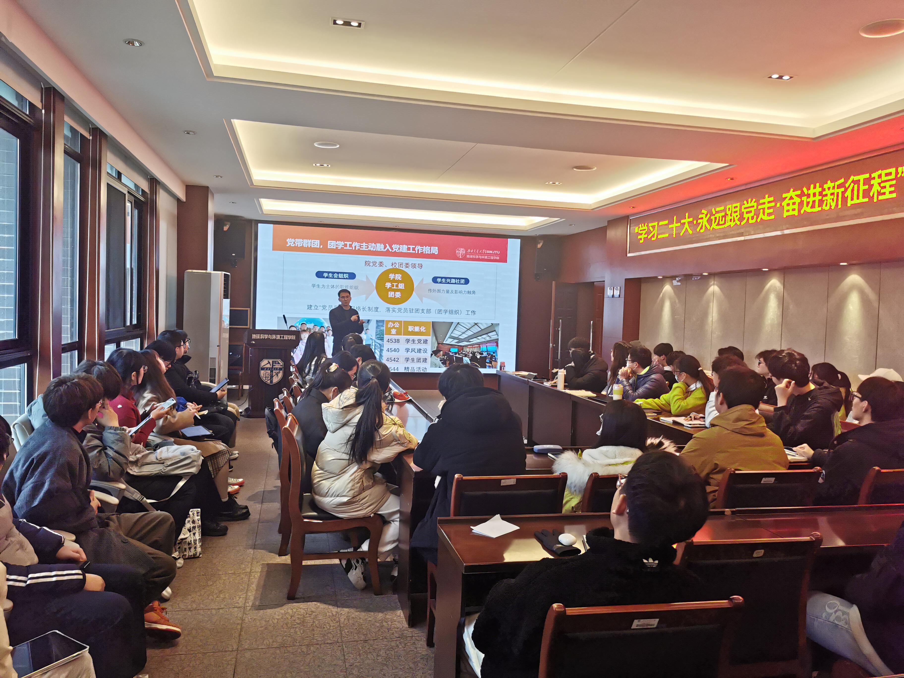 会议最初,杨都强老师就学生干部深入学习贯彻党的二十大精神做了明确要求,鼓励同学们先通过读原文等形式产生自己对党的二十大报告的理解,再到各个班级团支部之间开展学习宣讲活动。杨都强老师对党的二十大精神的重要内涵进行了宣讲,通过援引邓小平同志答记者问等例子,从多个层次对中国式现代化的五个特征进行解读,强调中国式现代化符合中国的国情特色。他号召同学们坚守奋斗精神,在深入领会二十大精神并向身边同学积极传播的同时,一定要注重把精神学习与自己的成长实际相结合,做到勤勉刻苦、准确把握、求真务实,展现学生干部青春本色。