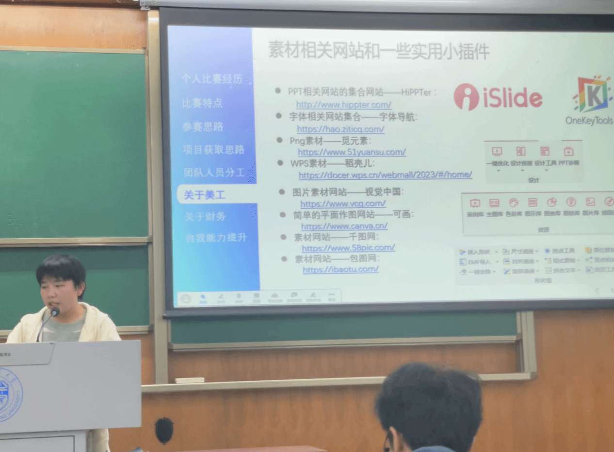 接下来,由经济管理学院学生黄家仪介绍创新创业类比赛中美工工作的经验分享。她以自身为例,告诉同学们要加强常见办公软件的学习和应用,日常生活中要善于收集好的设计案例,多实践,多练习,提高自己对美的鉴赏力和创造力。最后黄同学为同学们分享了自己平时常用的美工软件及线上免费学习课程。