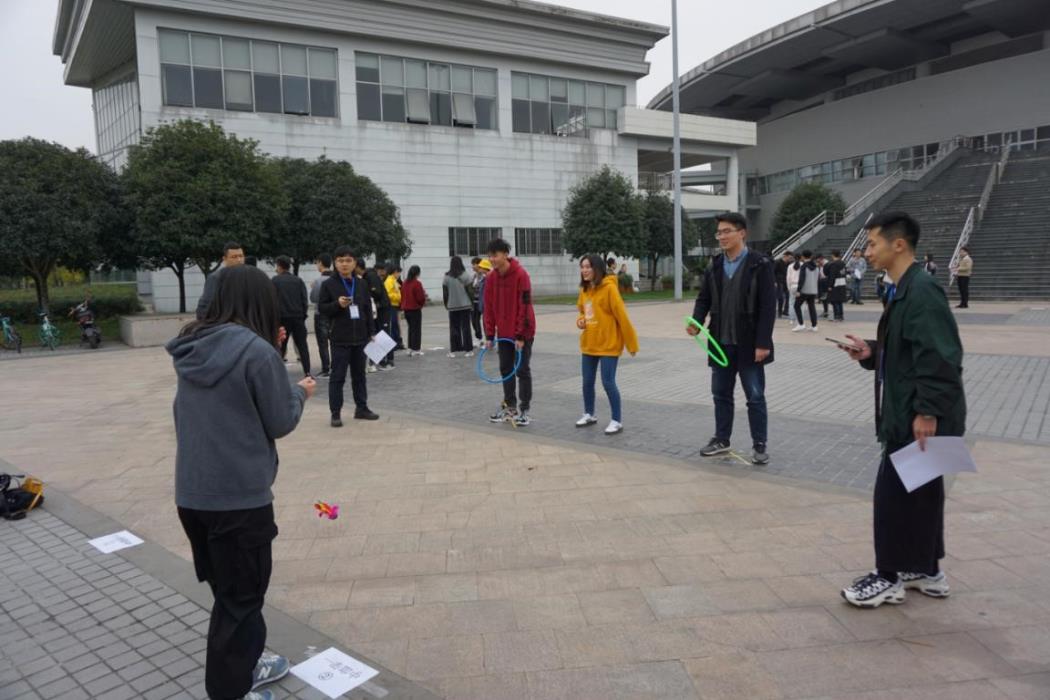 活动的第四个环节,游戏名称是“一击即中”,每组距离圈4米,每组成员依次将毽子置于鞋上,往圈里踢,踢完捡毽子交给下一个人。大家的默契程度进一步得到了增加。